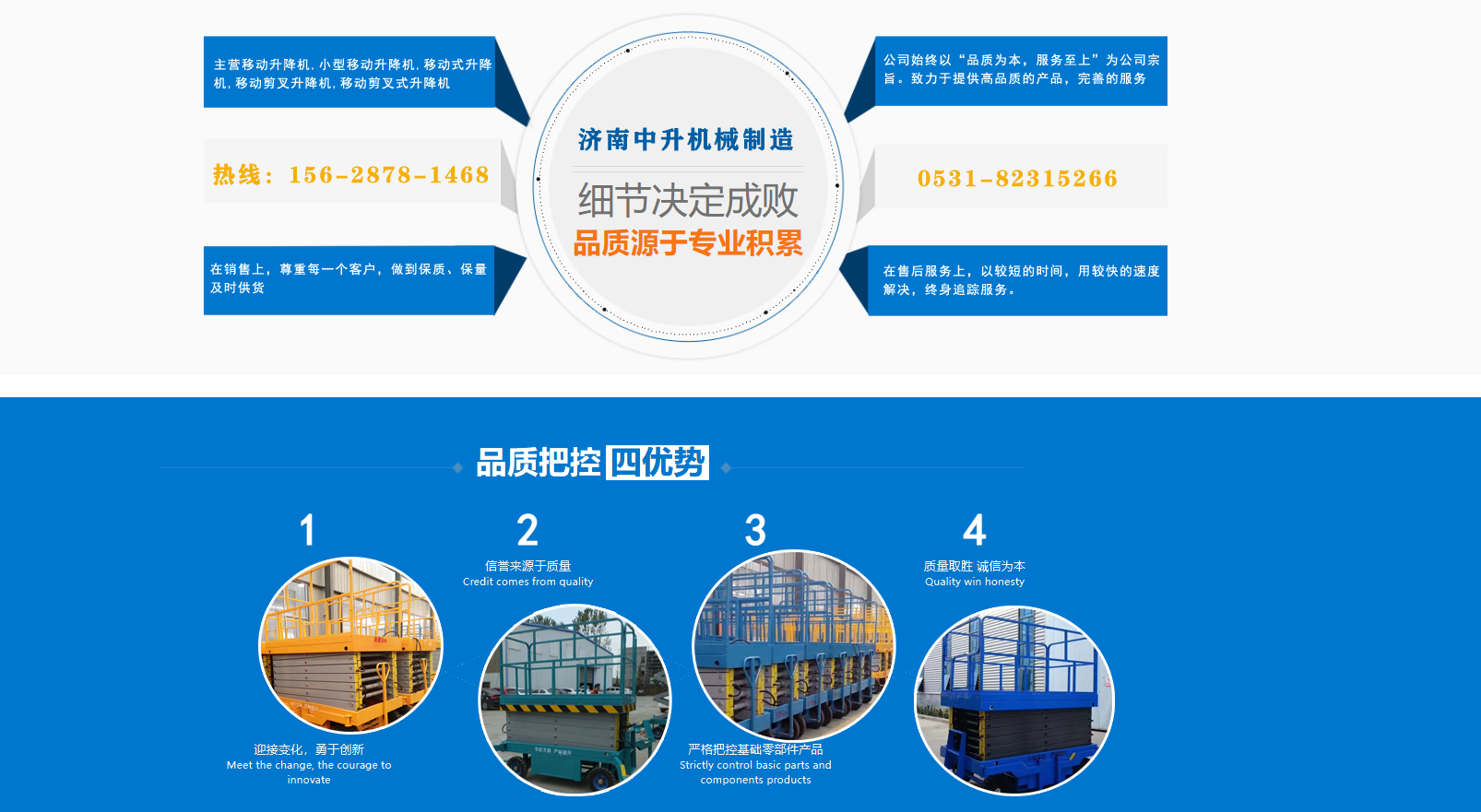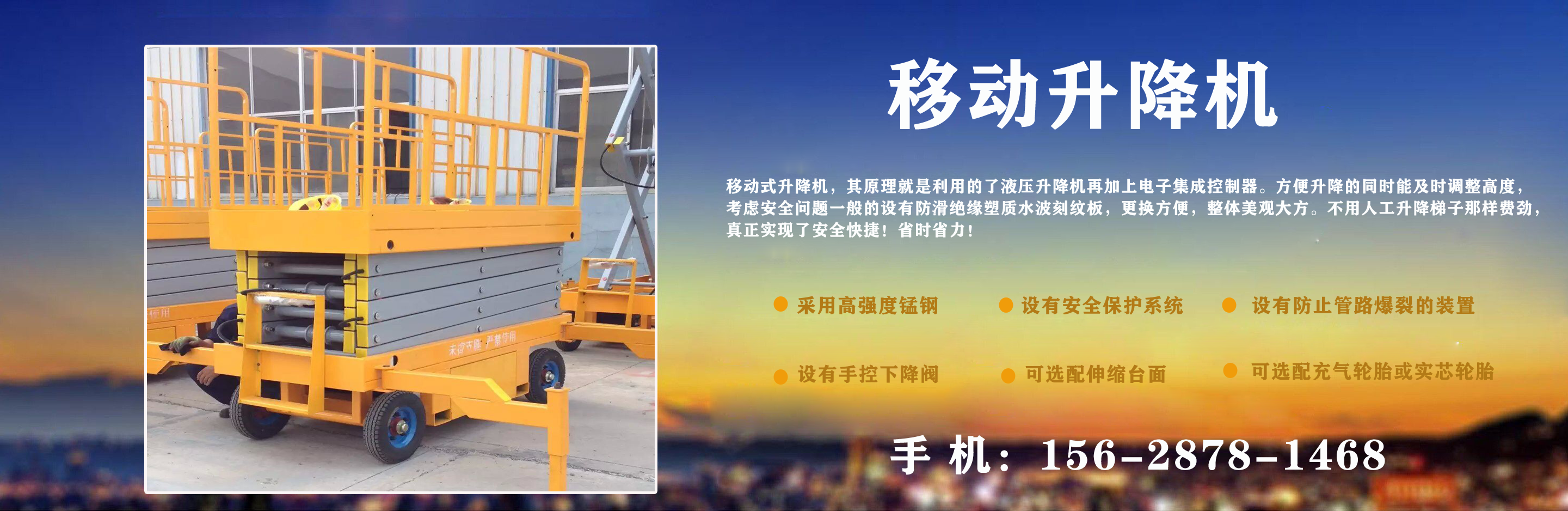 濟南中升機械制造有限公司主營移動升降機,小型移動升降機,移動式升降機,移動剪叉升降機,移動剪叉式升降機等產(chǎn)品,信譽良好,歡迎前來咨詢訂購! 在銷售上,尊重每一個客戶,做到保質(zhì)、保量及時供貨;在售后服務(wù)上,以較短的時間,用較快的速度解決,終身追蹤服務(wù)?! 」臼冀K以“品質(zhì)為本,服務(wù)至上”為公司宗旨。致力于提供高品質(zhì)的產(chǎn)品,完善的服務(wù),快捷的供貨,無論您身處何方,都能感受到我們的優(yōu)良服務(wù)??蛻糁辽希\信為本。 歡迎各界朋友來電,來函垂詢,選購!...